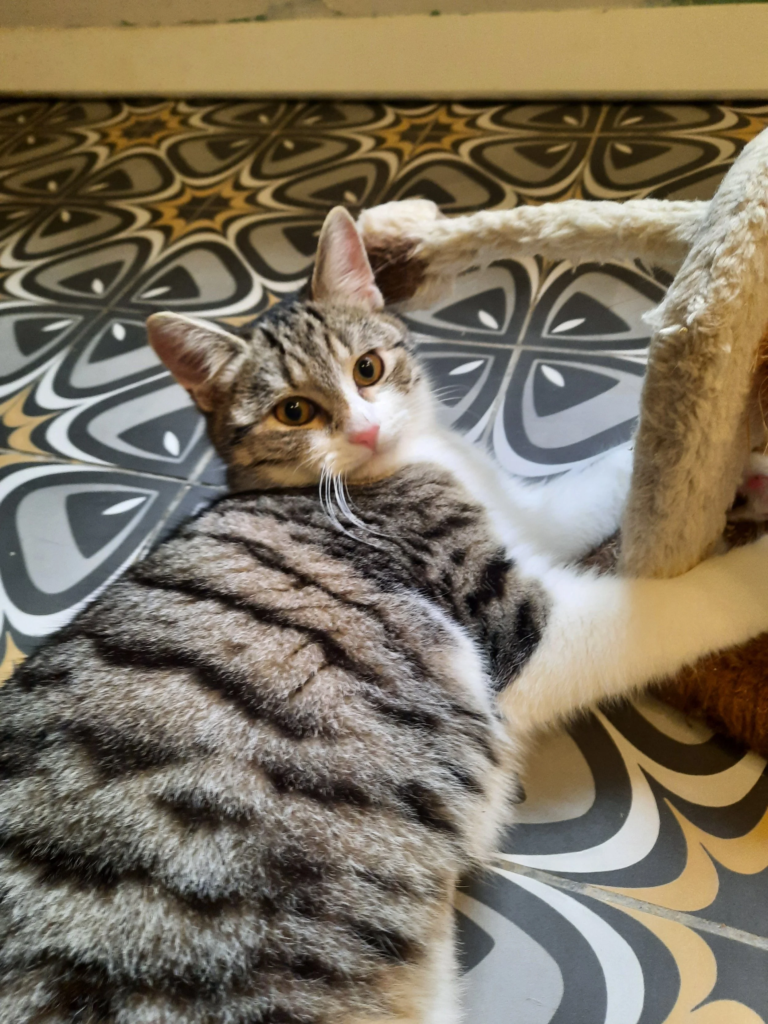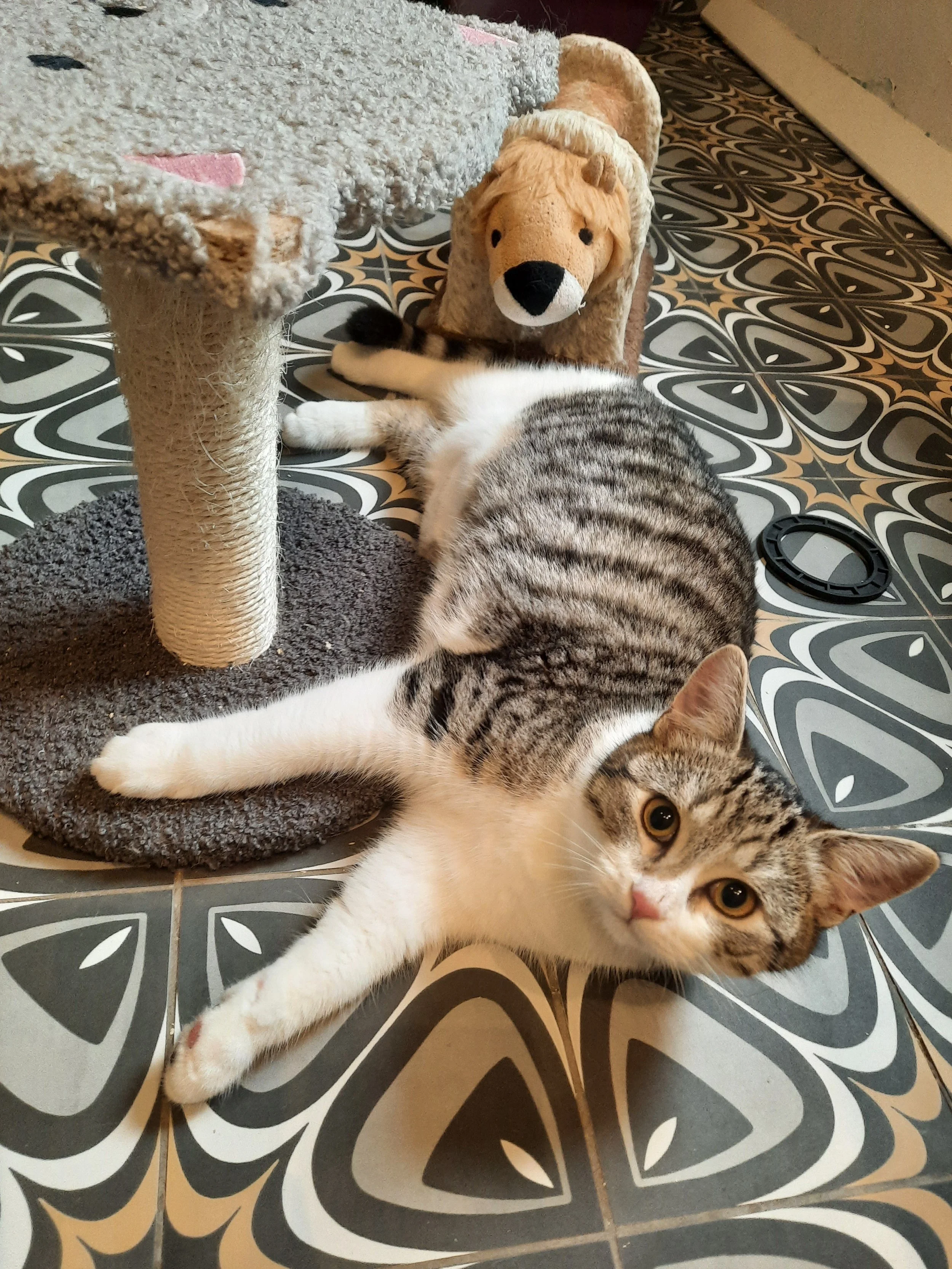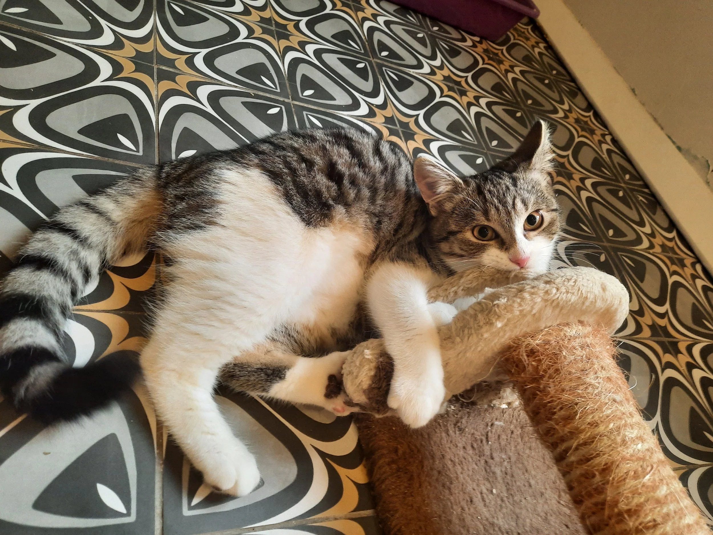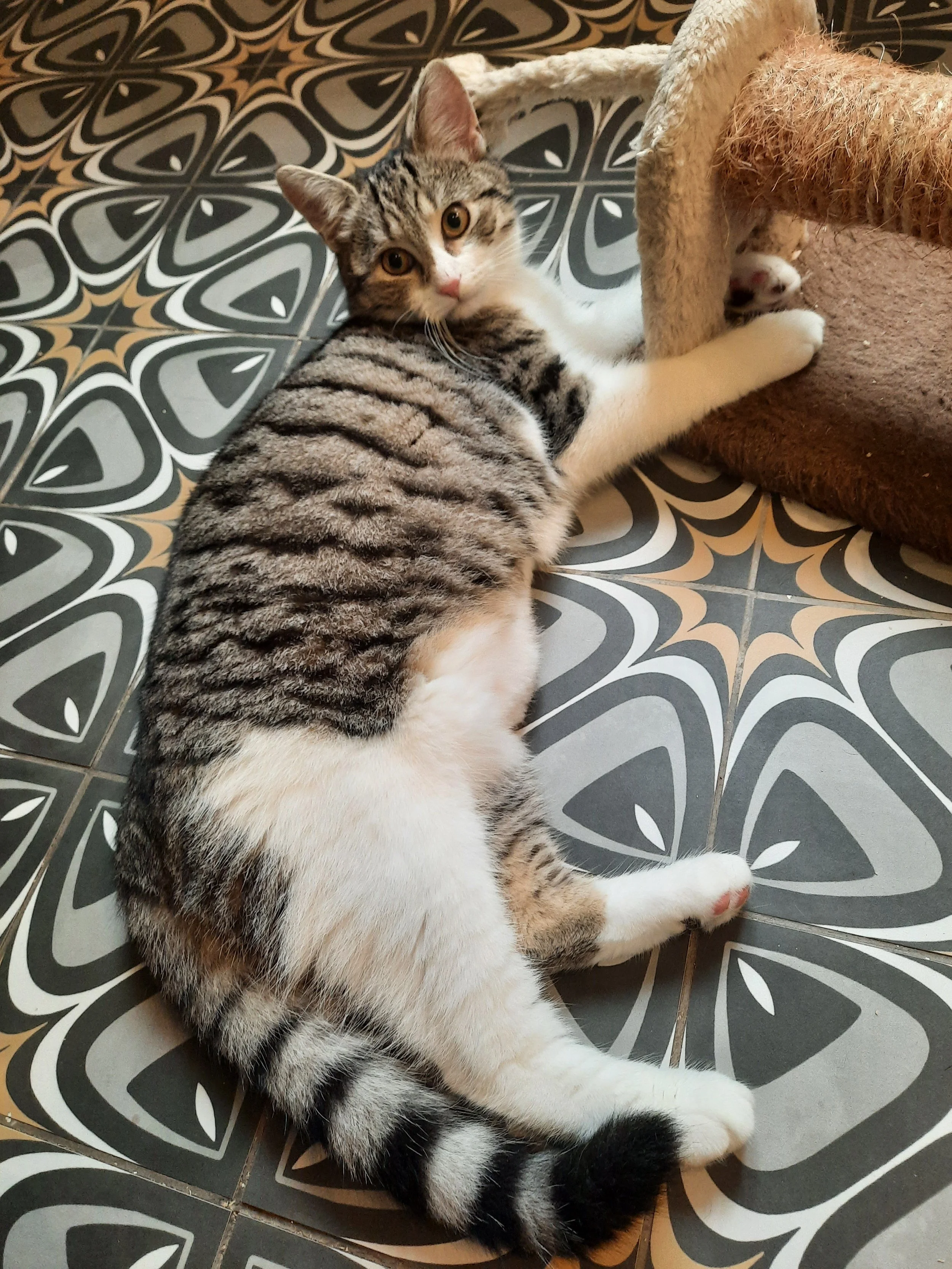 Descriptif de la personnalite du chat et de ses besoins : Alba profite de la présence de sa maman et de ses frères Archie et Arthur depuis sa naissance. Les débuts ont été compliqué au niveau alimentation, elle a été forte et est maintenant une jeune chatte au bidou bien rebondi.