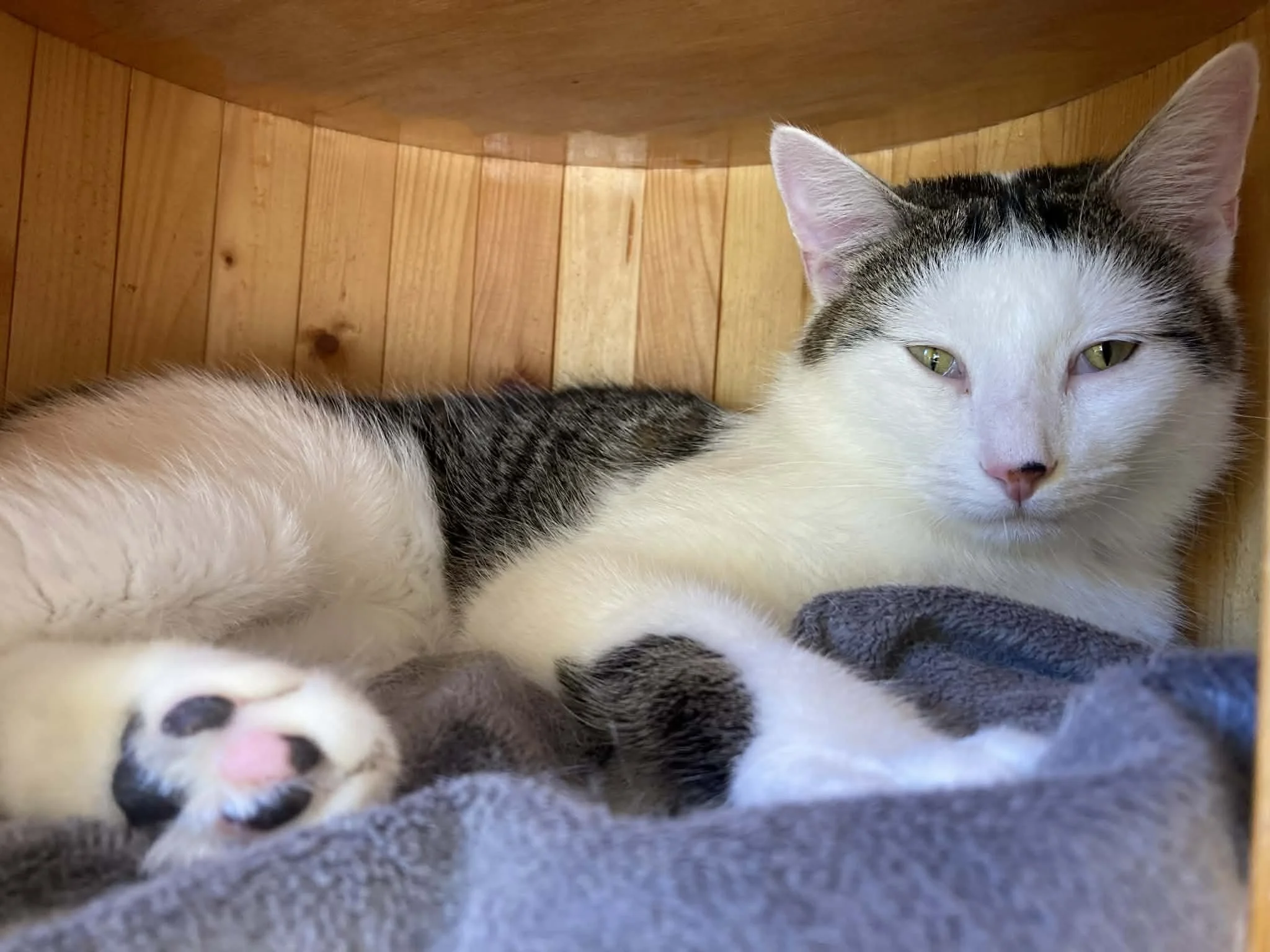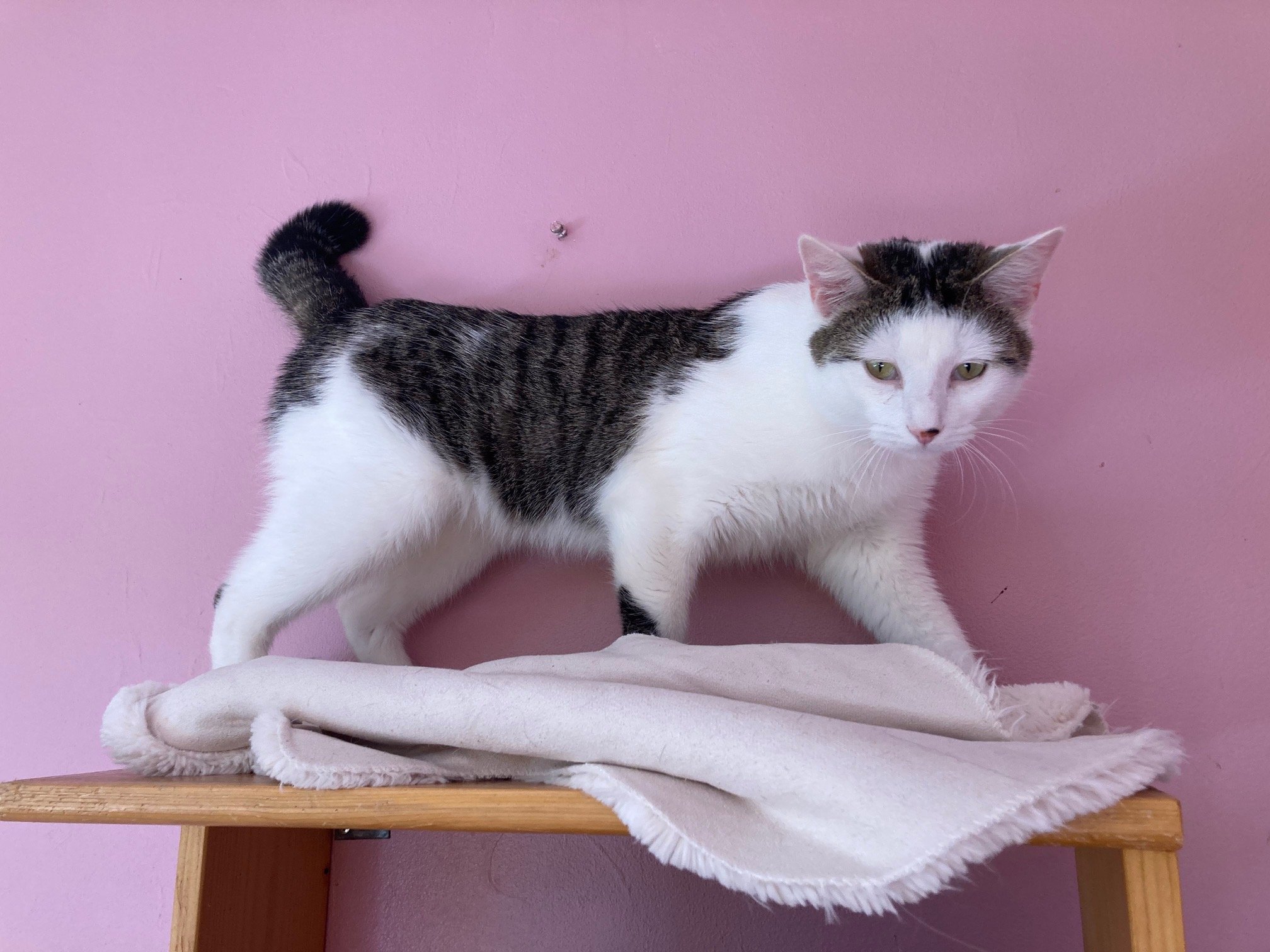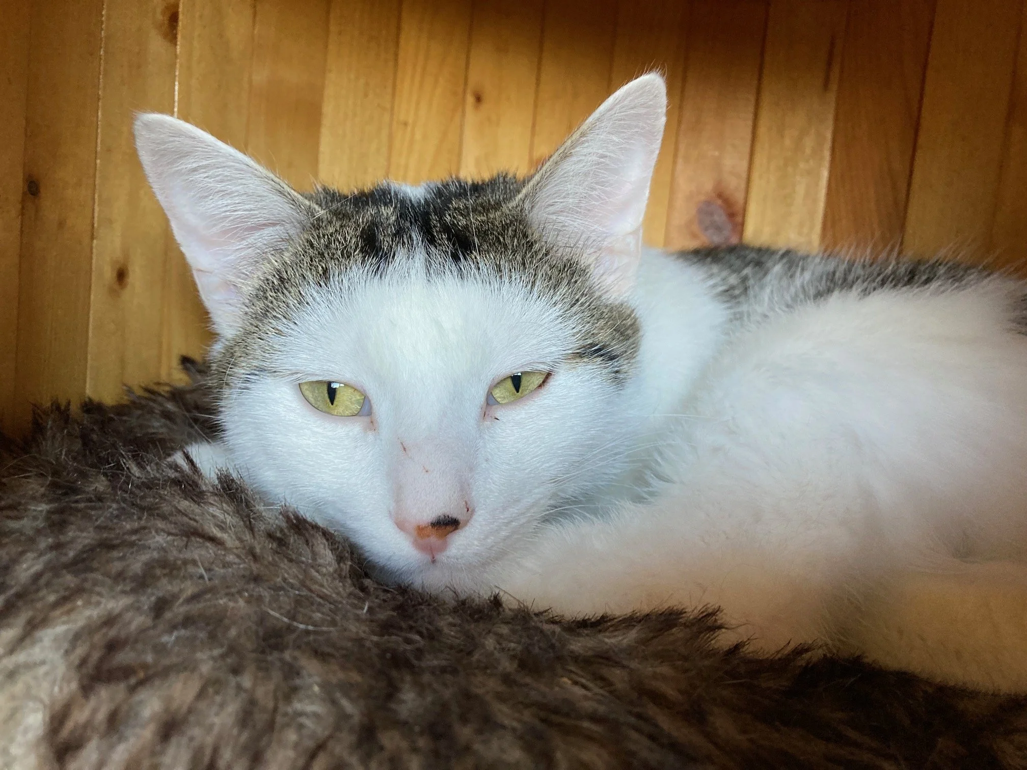 Whisky montre qu’il a complètement adopté le confort d’une maison et il est très amitueux autant avec l’équipe que les autres chats.