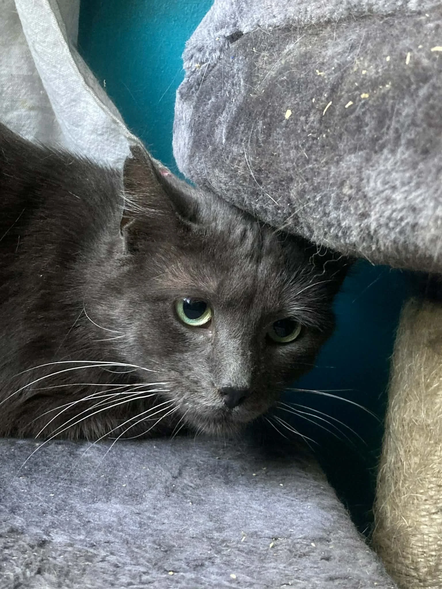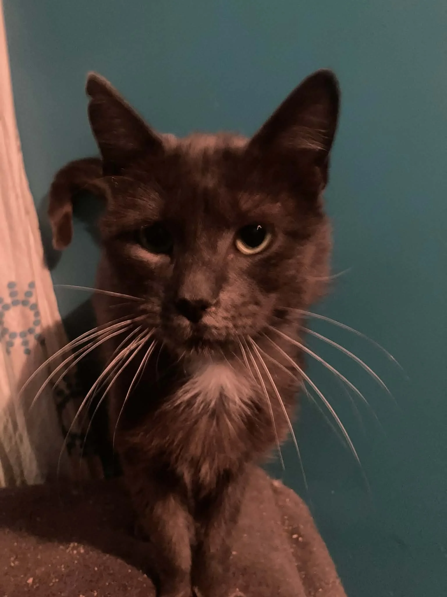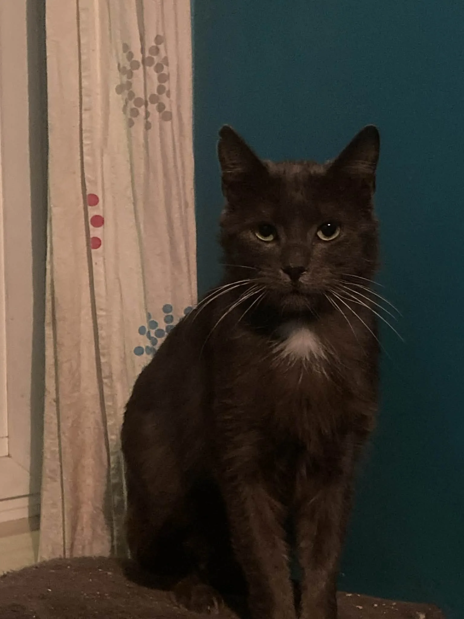 Descriptif de la personnalite du chat et de ses besoins : Bonjour moi c'est Tuck! Je suis un ancien chat errant. J'ai été soigné par 2 gentilles dames pendant 1 an mais un jour elles m'ont retrouvé plein d'huile/mazout. Elles m'ont emmené d'urgence chez un vétérinaire et après plusieurs bains j'ai retrouvé ma couleur d'origine!! On a décidé d'essayer de me trouver une famille plutôt que retourner à une vie d'errance. Je suis craintif, il faudra m'amadouer avec patience mais avec le temps je réclame des câlins. Je suis d'un tempérament très calme. Qui voudrait conquérir mon petit coeur de chat ??